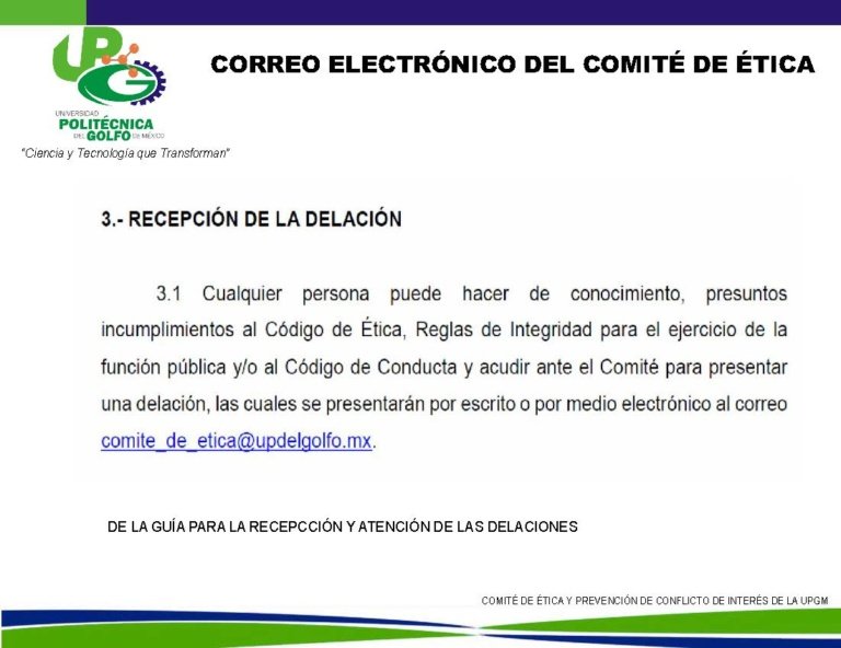 Por medio del correo comite_de_etica@updelgolfo.mx puedes hacernos llegar tus declaraciones sobre presuntos incumplimientos al Código de Ética.